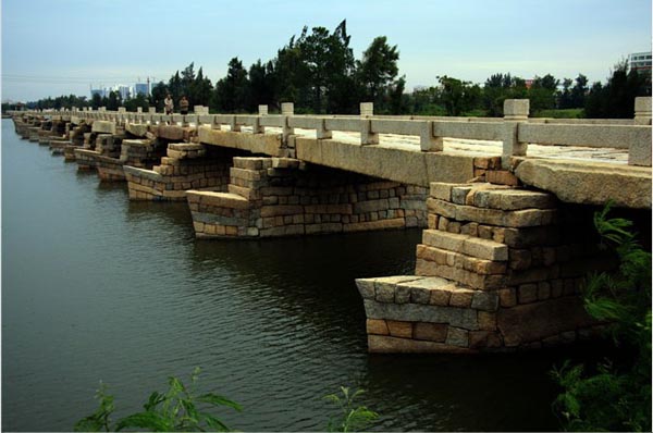 安平橋:屬于中國古代連梁式石板平橋,始建于南宋紹興八年(1138),歷時十四年告成。明清兩代曾多次重修。該橋是中古時代世界最長的梁式石橋,也是我國現(xiàn)存最長的海港大石橋。位于福建省晉江縣的安海鎮(zhèn),建于宋代,當(dāng)?shù)厝怂追Q“五里橋”。橋面由7條大石板鋪成,橋頭有五層六角磚砌成的寶塔一座,此橋為古代跨度最大的梁式石橋,有“天下無此長橋”的美稱。