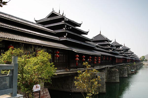 風(fēng)雨橋:坐落在廣西三江縣的程陽村邊的林溪河上,全橋為石墩木面瓦頂結(jié)合而成。橋上建有五座寶塔形狀的樓亭,可避風(fēng)雨。整座橋無一鐵釘,全用桁槽銜接,它斜穿直套、縱橫交錯,十分精致牢固。坐落在廣西三江林溪河上的程陽橋是風(fēng)雨橋的代表。因橋上建有廊和亭,既可行人,又可避風(fēng)雨,故稱風(fēng)雨橋。這座橋建于1916年,是一座四孔五墩伸臂木梁橋。其結(jié)構(gòu)以橋墩、橋身為主的兩部分。墩底用生松木鋪墊,用油灰沾合料石砌成菱形墩座,上鋪放數(shù)層并排巨杉圓木,再鋪木板作橋面,橋面上蓋起瓦頂長廊橋身。橋身為四柱抬樓式建筑,橋頂建造數(shù)個高出橋身的瓦頂數(shù)層飛檐翅起角樓亭、美麗、壯觀。五個石墩上各筑有寶塔形和宮殿形的橋亭,逶迤交錯,氣勢雄渾。長廊和樓亭的瓦檐頭均有雕刻繪畫,人物、山水、花、獸類色澤鮮艷,栩栩如生,是侗鄉(xiāng)人民智慧的結(jié)晶