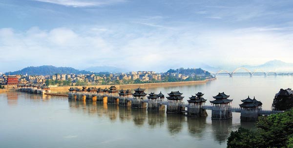 廣濟橋,俗稱湘子橋,宋乾道七年(1171年)太守曾江創(chuàng)建,初為浮橋,由八十六只巨船連結(jié)而成始名“康濟橋”。 淳熙元年間(1174年)浮橋被洪水沖垮,太守常煒重修之,并創(chuàng)杰閣于西岸,開始了西岸橋墩的建筑,至紹定元年(1194年)歷五十四年間,朱江、王正功、丁允元、孫叔謹(jǐn)?shù)忍叵嗬^增筑,完成了十個橋墩的建造。其中又以淳熙十六年(1189年)太守丁允元建造的規(guī)模最大、功績最著而改稱西橋為“丁公橋”。該橋是現(xiàn)存較早的開關(guān)活動式大石橋。