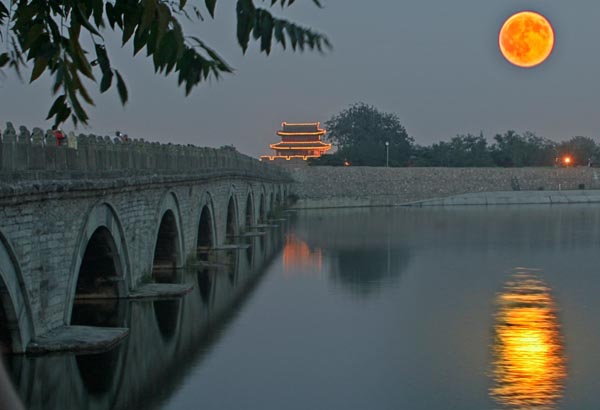 盧溝橋:始建于金大定二十九年(1189年),明正統(tǒng)九年(1444年)重修。清康熙1697年時毀于洪水,康熙三十七年(1698年)重建,坐落在北京廣安門西南約10公里之處,該橋因跨越在盧溝河上(今永定河)因而得名盧溝橋,是北京市現(xiàn)存最古老的石造聯(lián)拱橋。盧溝橋全長266.5米,寬7.5米,最寬處可達(dá)9.3米。有橋墩十座,共11個橋孔,整個橋身都是石體結(jié)構(gòu),關(guān)鍵部位均有銀錠鐵榫連接,為華北最長的古代石橋。全橋均用白石建成,兩邊石欄雕柱各140根,石柱頭上雕有蹲伏形態(tài)各異石獅子485只。