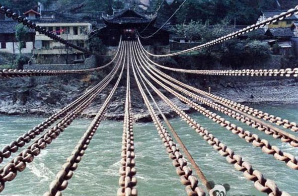 鐵索橋:中國現(xiàn)存的古老鐵索橋之一。又稱瀘定橋。位于四川省瀘定縣城西,跨越大渡河。清康熙四十四年(1705 )九月動工,次年四月完工。橋凈跨 100 米,凈寬 2.8 米,橋面距枯水位 14.5 米。全橋共用鐵索鏈 13 根,,鐵鏈粗如碗口, 每根長150米左右,重約一噸,其中 9 根用作承重底索,上覆橫縱木板作橋面,可通行人、畜; 4 根用作扶手,布置在橋面兩側(cè)。