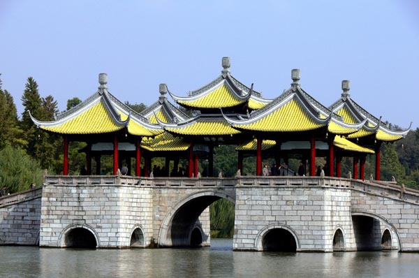 五亭橋:建于乾隆二十二年(1757年),是仿北京北海的五龍亭和十七孔橋而建的,位于江蘇揚州瘦西湖內(nèi),橋基由12條大青石砌成,橋身為拱圈形。上建五亭、下列四翼,橋洞正側(cè)凡十有五,由3種不同的圈洞聯(lián)合,共有15孔,孔孔相通,橋上置有五亭,而且亭與亭之間又以廊相連。既有南方之秀,也有北方之雄。