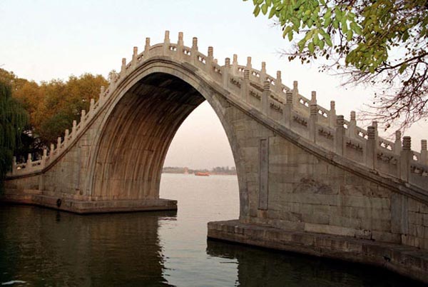 玉帶橋:玉帶橋位于北京頤和園昆明湖長堤上,建于清乾隆年間(公元1736-1795年)。該橋單孔凈跨11.38米,矢高約7.5米,全部用玉石琢成,橋面是雙反向曲線,組成波形線橋型,配有精制白石欄板,顯得格外富麗堂皇。此橋位于北京頤和園內(nèi),全橋用漢白玉石建成,拱圈為蛋形,兩側(cè)雕刻精美的欄板和望柱,通體潔白、線條流暢。遠(yuǎn)望猶如一條玉帶點綴在碧波粼粼的昆明湖上,被游客贊為“海上仙島”