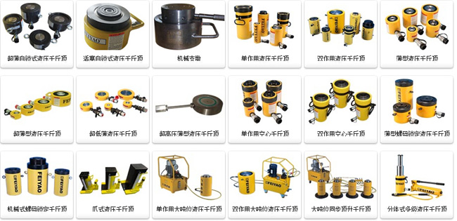 飛耀液壓千斤頂型號有幾十種,有本體高度很低的FY-RCS薄型、FY-RSM超薄型、FY-STC超低薄型、FY-UTC超高壓超低薄型。有用途廣泛的FY-RC單作用、FY-RR雙作用。有承載能力很大的FY-CLSG單作用大噸位、FY-CLRG雙作用大噸位。有活塞桿是中空的FY-RCH單作用中空型、FY-RRH雙作用中空型。有活塞桿帶螺紋的FY-CLP薄型螺母鎖定液壓千斤頂、FY-CLL機械式螺母鎖定千斤頂。以及鋁合金材質(zhì)的FY-RAC鋁制單作用千斤頂、FY-RAR鋁制雙作用千斤頂、FY-RACH鋁制中空千斤頂。另還有連體頂、機械頂、車載式頂?shù)鹊,這里就不一一介紹。