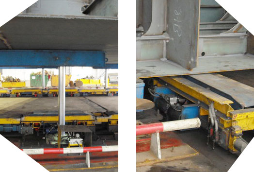 當(dāng)各船體頂升到位后,將平板小車放置于船體之下,以便進(jìn)行船體的移動(dòng)。某些船體更要放置三維調(diào)整設(shè)備,以便對(duì)船體的三個(gè)維度都進(jìn)行控制。